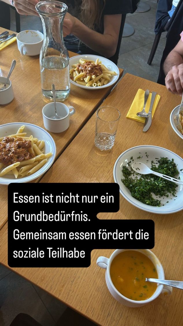 Wer sich in der Gruppe unwohl fühlt oder aus anderen Gründen nicht vor Ort essen möchte, kann das Essen auch mitnehmen. So bleibt das Angebot für alle zugänglich.